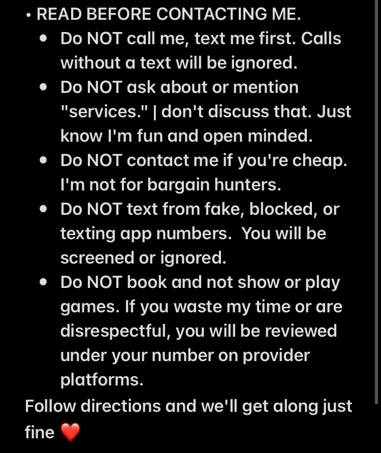 My regulars already know… I take very good care of the people who take care of me 💋 I appreciate you more than you know. I genuinely love my regulars. That being said… I absolutely love meeting new faces too 👀 For your peace of mind, I’m happy to FaceTime/video verify AFTER your appointment is booked. 🚫 I do NOT FaceTime beforehand So please don’t ask unless you’re ready to secure your time. If you FaceTime me and don’t book, I will post reviews about you on provider sites so everyone knows you’re a time waster just looking for free FaceTime. Don’t test it. 📵 No calls please — TEXT ONLY ⚠ Services are NEVER discussed over text . If you know, you know. Respect goes both ways. Serious inquiries only. If you’re ready to book and be part of something consistent, fun, and worth your time… I’m waiting 💕